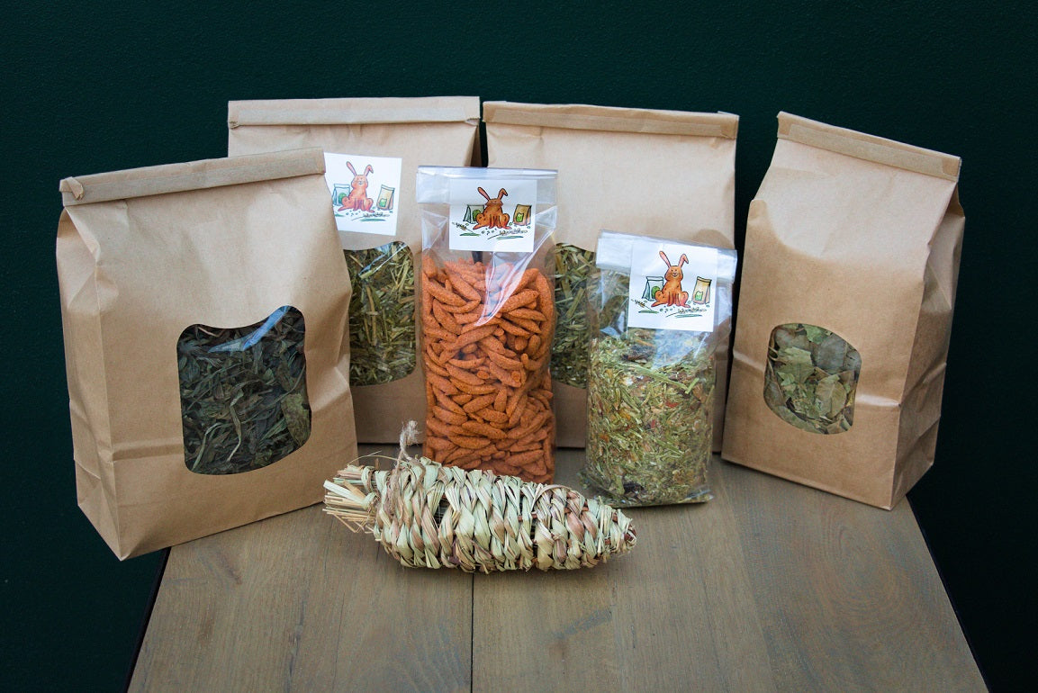 Elke maand een wisselende unieke box vol heerlijke gedroogde kruiden, bladeren, ruwvoer, natuurlijk knaagmateriaal, gezonde snoepjes en een speeltje.